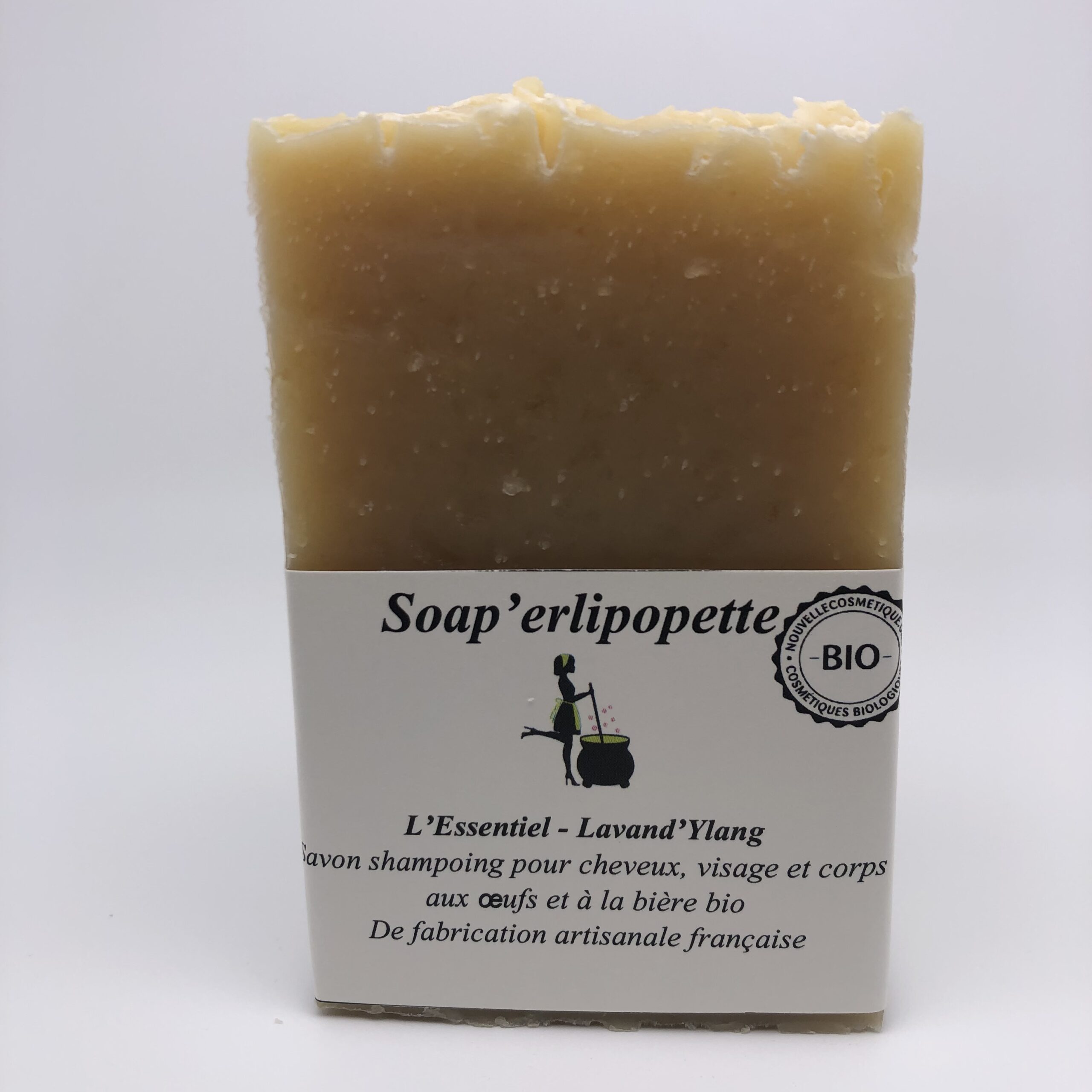 Fabriqué avec de la bière*, de l’huile de coco*, d’olive*, de karité*,de cameline*, de ricin*, d’amande douce*, du jaune d’œuf*, de l’argile blanche, parfumé aux huiles essentielles de lavandin*, ylang ylang* et romarin*.